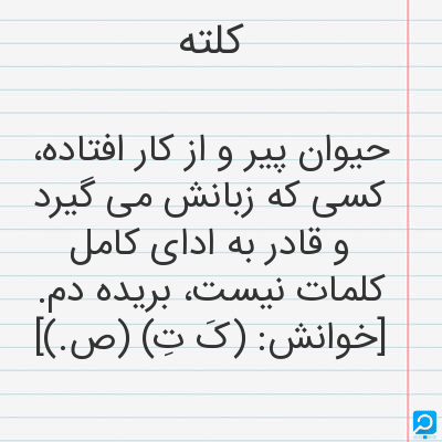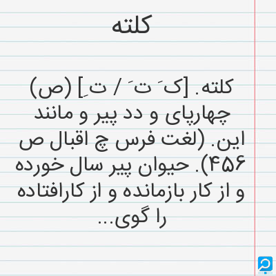 کلته. [ک َ ت َ / ت ِ] (ص) چهارپای و دد پیر و مانند این. (لغت فرس چ اقبال ص 456). حیوان پیر سال خورده و از کار بازمانده و از کارافتاده را گویند از هر قسم که باشد اعم از دد ودام و غیره. (برهان). حیوانی که پیر شده باشد از هرجنس که باشد. (آنندراج). حیوان پیر سالخورده ٔ از کار بازمانده و از کار افتاده خواه وحشی باشد و یا اهلی. (ناظم الاطباء). چهارپای پیر. دد کهن سال. (فرهنگ فارسی معین). چهارپای و دد پیر و موی ریخته و ضعیف شده. لکنته. (یادداشت به خط مرحوم دهخدا):