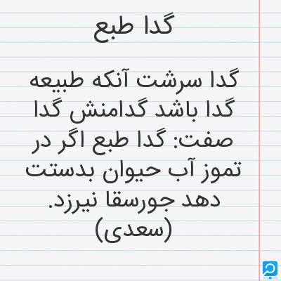 گدا سرشت آنکه طبیعه گدا باشد گدامنش گدا صفت: گدا طبع اگر در تموز آب حیوان بدستت دهد جورسقا نیرزد. (سعدی)