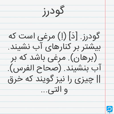گودرز. [دَ] (اِ) مرغی است که بیشتر بر کنارهای آب نشیند. (برهان). مرغی باشد که بر آب بنشیند. (صحاح الفرس). || چیزی را نیز گویند که خرق و التیام نپذیرد، یعنی از هم جدا نشود و به هم نیاید، و این معنی در فلکیات جاری است، لاغیر. (برهان). ظاهراً از برساخته های فرقه ٔ آذرکیوان است. (از حاشیه ٔ برهان قاطع چ معین).