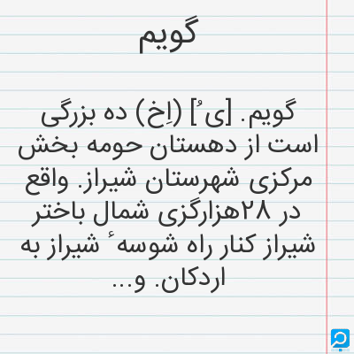 گویم. [ی ُ] (اِخ) ده بزرگی است از دهستان حومه بخش مرکزی شهرستان شیراز. واقع در 28هزارگزی شمال باختر شیراز کنار راه شوسه ٔ شیراز به اردکان. واقع در جلگه و هوای آن معتدل و سکنه ٔ آن 2040 تن است. آب آن از قنات و چشمه تأمین میشود. محصول عمده ٔ آن غلات، حبوب، صیفی و انگور دیمی و شغل اهالی زراعت و باغداری است. دبستان دارد. (از فرهنگ جغرافیایی ایران ج 7).