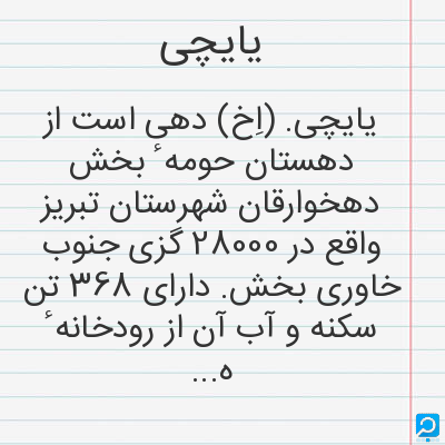 یایچی. (اِخ) دهی است از دهستان حومه ٔ بخش دهخوارقان شهرستان تبریز واقع در 28000 گزی جنوب خاوری بخش. دارای 368 تن سکنه و آب آن از رودخانه ٔ هرکلان است. (از فرهنگ جغرافیایی ایران ج 4).