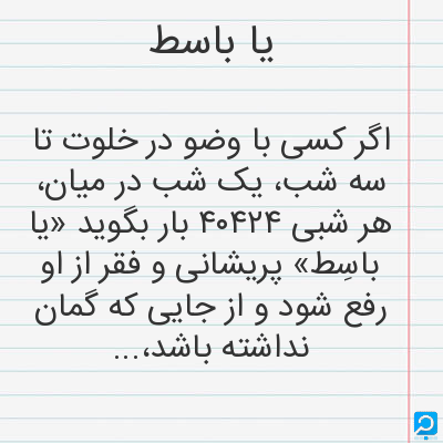 اگر کسی با وضو در خلوت تا سه شب، یک شب در میان، هر شبی ۴۰۴۲۴ بار بگوید «یا باسِط» پریشانی و فقر از او رفع شود و از جایی که گمان نداشته باشد، به او روزی خواند رسید.