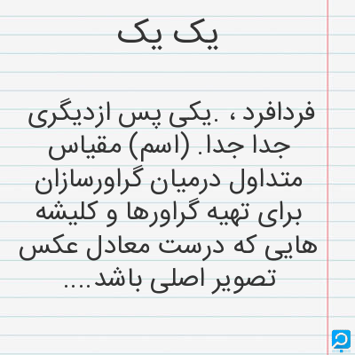 یکی پس ازدیگری. ، فردافرد جدا جدا. (اسم) مقیاس متداول درمیان گراورسازان برای تهیه گراورها و کلیشه هایی که درست معادل عکس تصویر اصلی باشد.