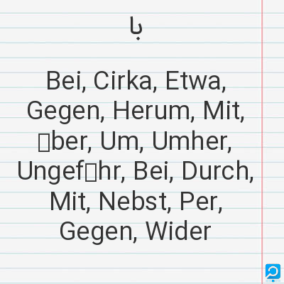 Bei, Cirka, Etwa, Gegen, Herum, Mit, Über, Um, Umher, Ungefähr, Bei, Durch, Mit, Nebst, Per, Gegen, Wider