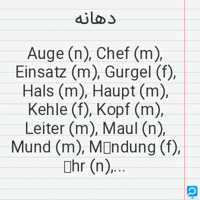 Auge (n), Chef (m), Einsatz (m), Gurgel (f), Hals (m), Haupt (m), Kehle (f), Kopf (m), Leiter (m), Maul (n), Mund (m), Mündung (f), Öhr (n), Eröffnung, Öffne, Öffnend, Öffnung, Ausstoßen, Düse (f), Strahl (m), Wasserstrahl (m)