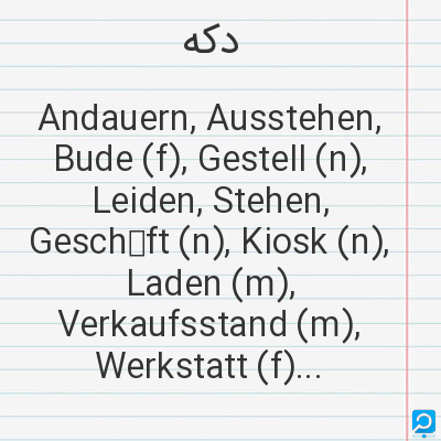 Andauern, Ausstehen, Bude (f), Gestell (n), Leiden, Stehen, Geschäft (n), Kiosk (n), Laden (m), Verkaufsstand (m), Werkstatt (f)