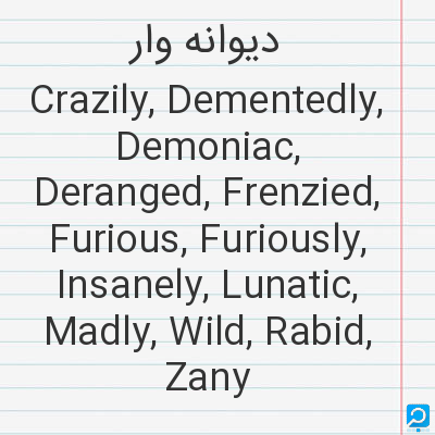 Crazily, Dementedly, Demoniac, Deranged, Frenzied, Furious, Furiously, Insanely, Lunatic, Madly, Wild, Rabid, Zany