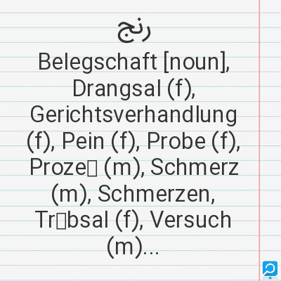 Belegschaft [noun], Drangsal (f), Gerichtsverhandlung (f), Pein (f), Probe (f), Prozeß (m), Schmerz (m), Schmerzen, Trübsal (f), Versuch (m)