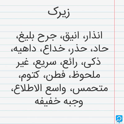 انذار، انیق، جرح بلیغ، حاد، حذر، خداع، داهیه، ذکی، رائع، سریع، غیر ملحوظ، فطن، کتوم، متحمس، واسع الاطلاع، وجبه خفیفه