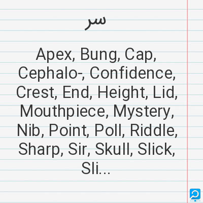 Apex, Bung, Cap, Cephalo-, Confidence, Crest, End, Height, Lid, Mouthpiece, Mystery, Nib, Point, Poll, Riddle, Sharp, Sir, Skull, Slick, Slide, Summit, Tip, Top, Vertex, Whisper