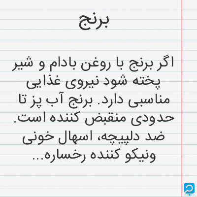 اگر برنج با روغن بادام و شیر پخته شود نیروی غذایی مناسبی دارد. برنج آب پز تا حدودی منقبض کننده است. ضد دلپیچه، اسهال خونی ونیکو کننده رخساره است. در چین معتقدند برنج ضد اضطراب و عطش است. و گازهای معده را از بین می برد. اگر با آب برنج مروارید و جواهر رابشویند آن را جلا می دهد. خوردن شیر با برنج برای دلپیچه مفید است.
