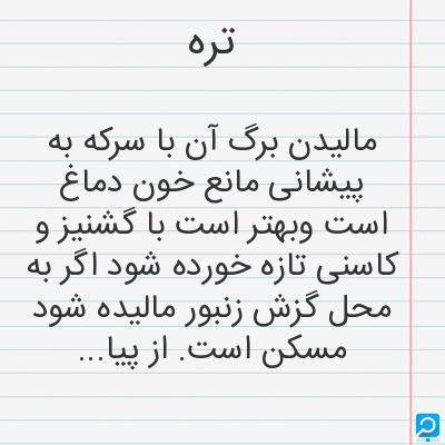 مالیدن برگ آن با سرکه به پیشانی مانع خون دماغ است وبهتر است با گشنیز و کاسنی تازه خورده شود اگر به محل گزش زنبور مالیده شود مسکن است. از پیاز دیر هضم تر ونفاخ تر است قاطع خونریزی بینی به صورت چکاندن آن در بینی است. مصرف تره قبل وبعد از غذا باعث هضم ومانع ترش کردن است. در بیماری های ریوی اگر با جو و مرغ بصورت سوپ مصرف شود مناسب است.