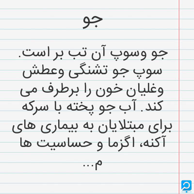 جو وسوپ آن تب بر است. سوپ جو تشنگی وعطش وغلیان خون را برطرف می کند. آب جو پخته با سرکه برای مبتلایان به بیماری های آکنه، اگزما و حساسیت ها مفید است. (به صورت مالیدنی). آب جو داروی سینه است البته آب جو برای معده مفید نیست و سرد است.