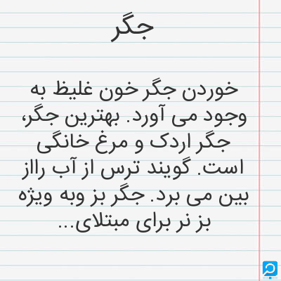 خوردن جگر خون غلیظ به وجود می آورد. بهترین جگر، جگر اردک و مرغ خانگی است. گویند ترس از آب رااز بین می برد. جگر بز وبه ویژه بز نر برای مبتلایان به صرع عود بیماری آنان می گردد. جگر وزغ را بردندان کرم خورده مالند تسکین یابد.