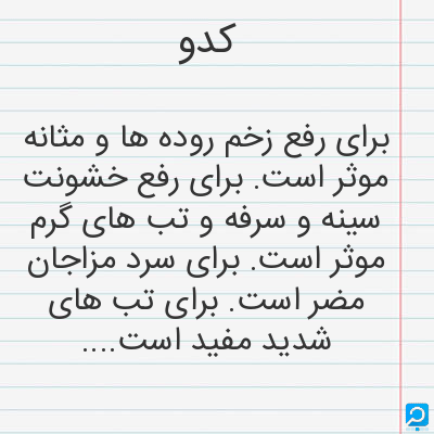 برای رفع زخم روده ها و مثانه موثر است. برای رفع خشونت سینه و سرفه و تب های گرم موثر است. برای سرد مزاجان مضر است. برای تب های شدید مفید است. اگر کدو حلوایی را پخته و گرم گرم به صورت بمالند صورت را زیبا می کند. پایین آورنده قند خون و چربی اضافی است. همچنین پایین آورنده کلسترول نیز می باشد.