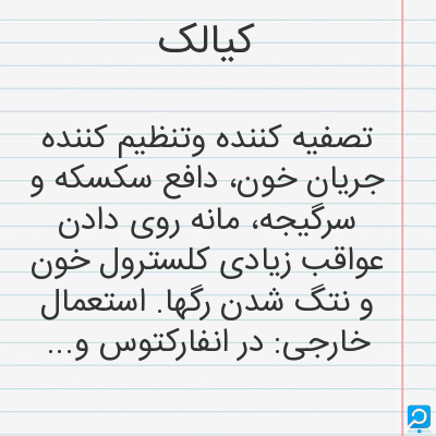 تصفیه کننده وتنظیم کننده جریان خون، دافع سکسکه و سرگیجه، مانه روی دادن عواقب زیادی کلسترول خون و نتگ شدن رگها. استعمال خارجی: در انفارکتوس و کمپرس در ناحیه قلب و ناراحتی های ریوی موثر است. قبل از غذا با یک لیوان آب سرد میل شود.