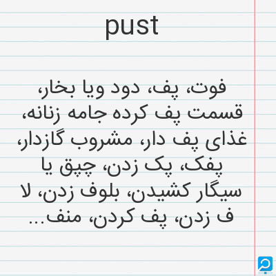 فوت، پف، دود ویا بخار، قسمت پف کرده جامه زنانه، غذای پف دار، مشروب گازدار، پفک، پک زدن، چپق یا سیگار کشیدن، بلوف زدن، لا ف زدن، پف کردن، منفجر کردن، منفجر شدن، وزش باد، وزیدن،